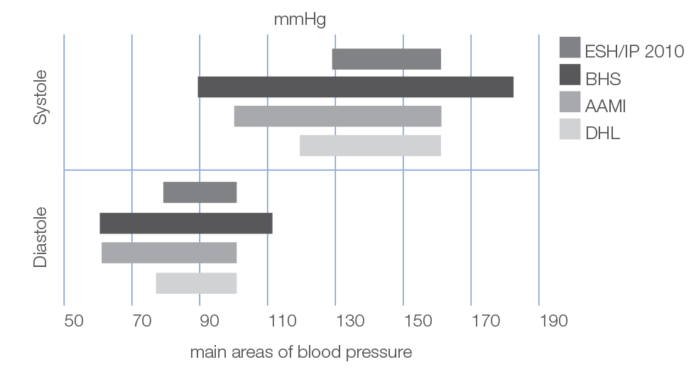 Skirtis gali ir tiriamos kraujospūdžio  ribos. Tiriamos kraujospūdžio matuoklių tikslumo intervalo ribos skiriasi priklausomai nuo protokolo.  Kuo platesnis validuotas intervalas, tuo patikimesnis kraujospūdžio matuoklis.